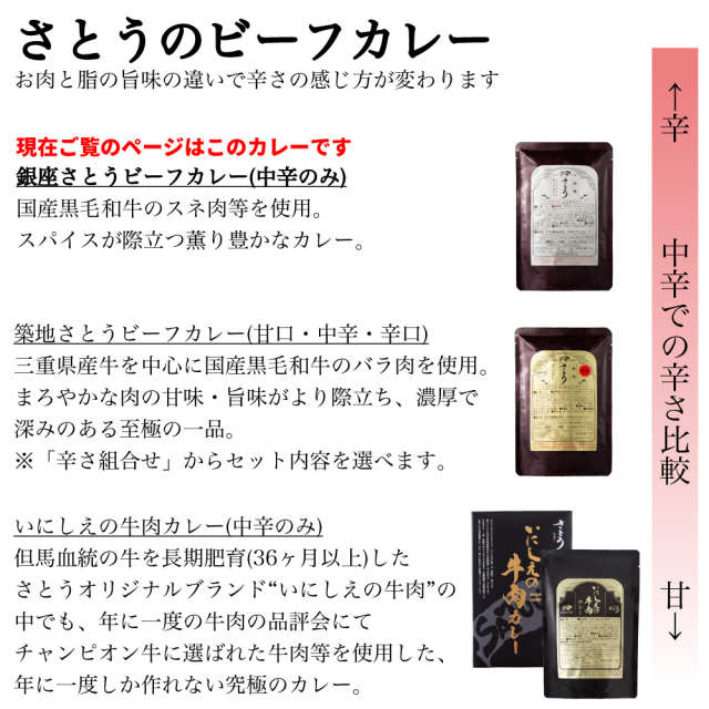さとうが契約農家や市場の競りで選び抜いた黒毛和牛を使用したレトルトビーフカレー。大切な方への贈り物にも、ご自宅用にも、大変人気のある商品です。